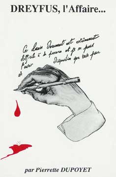 Thème : Ce spectacle met en scène l'une des Affaires les plus sulfureuses du siècle dernier. De la sinistre dictée qui fit accuser à tort de haute trahison le Capitaine Dreyfus, jusqu'à la réhabilitation tardive, en passant par la dégradation, la déportation à l'Ile du Diable, la Révision du Procès, à Rennes tous les évènements importants de cette Affaire sont évoqués. Le point de vue choisi est celui du Capitaine Dreyfus lui-même. Décor : Bureau du Chef d'état major / Prison à l'Ile du diable / Tribunal à Rennes Accompagnement musical : René Aubry, Phil Glass, Enya, Bernardo Sandoval Création Bande-son : Jean-Marie BOURDAT Texte : publié aux Editions La Traverse Presse : "Beaucoup d'humanité Texte magnifique dénonçant l'injustice et l'intolérance. Criant de Vérité, criant la Vérité Grande performance d'actrice Pierrette Dupoyet va à l'essentiel. Hymne à la tolérance. Cri d'alarme beau, grand, fort, universel ! Vibrant monologue teinté d'angoisse, d'amour et d'espoir Force et efficacité du jeu et du texte Vrai plaidoyer en faveur des Droits de l'Homme" Tournées : France, Hongrie, Ile de La Réunion N.B. : Le texte de Pierrette Dupoyet a bénéficié des conseils et encouragements de la LIGUE des DROITS de l'HOMME. Il a été préfacé par Michel Dreyfus, arrière petit-fils du Capitaine Dreyfus qui a écrit notamment " Il faut savoir gré à Pierrette Dupoyet de mettre son talent au service de ce combat contre l'arbitraire et pour la justice " (1995)